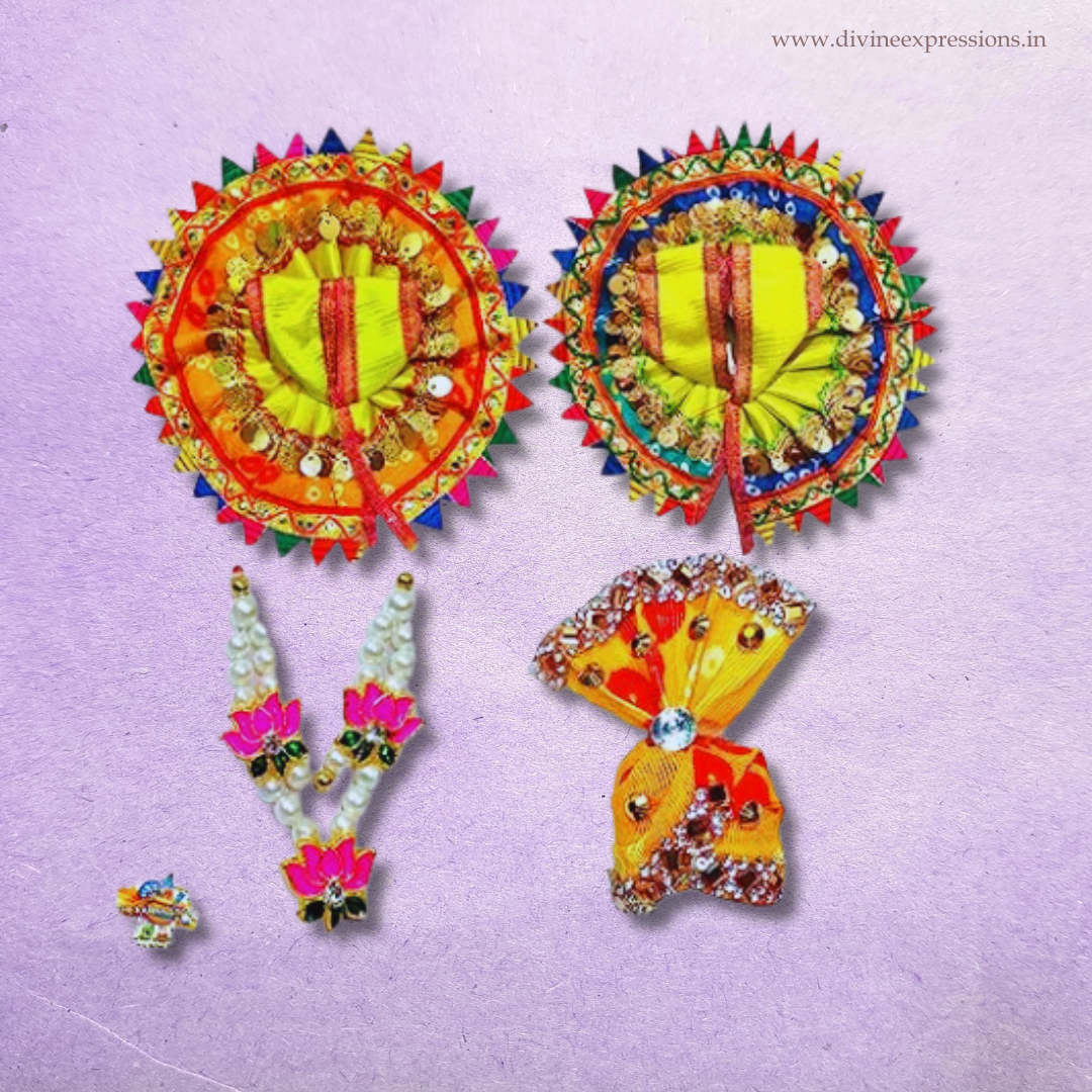 This exquisite gift set includes a beautifully designed dress adorned with intricate details, vibrant colors, and fine craftsmanship, perfectly fitting the beloved Laddu Gopal. Alongside the dress, the set includes a matching turban (pagdi) or crown, enhancing the regal appearance of Laddu Gopal. Additionally, the gift set features a selection of accessories such as jewelry, anklets, and a necklace, adding a touch of elegance and divine radiance. Each piece in this gift set is thoughtfully chosen to express love, devotion, and reverence towards Laddu Gopal. Present this complete gift set to honor the divine presence of Laddu Gopal and deepen your spiritual connection. Immerse yourself in the enchanting beauty of Laddu Gopal as you witness the divine form adorned with this complete gift set, symbolizing devotion, gratitude, and the eternal bond between the devotee and the beloved deity.