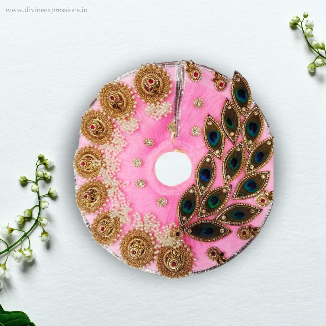 This exquisite dress features a delightful pink hue, symbolizing love and compassion, while paying homage to the majestic peacock. Adorned with intricate peacock feather motifs, it showcases the divine connection with nature. Made from a washable fabric, this dress ensures both convenience and durability, allowing Kanha Ji to shine brightly at all times. The delicate detailing of the peacock feathers adds an aura of elegance and splendor to the ensemble. Whether worn during sacred ceremonies or daily worship, this designer dress celebrates Kanha Ji’s divine presence with a harmonious blend of artistry, symbolism, and grace.