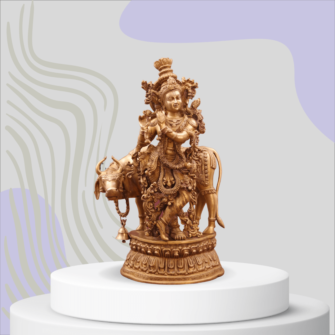 Introducing our divine Krishna Ji sitting on a Gau Mata (sacred cow) statue, a truly mesmerizing embodiment of spirituality and reverence.
